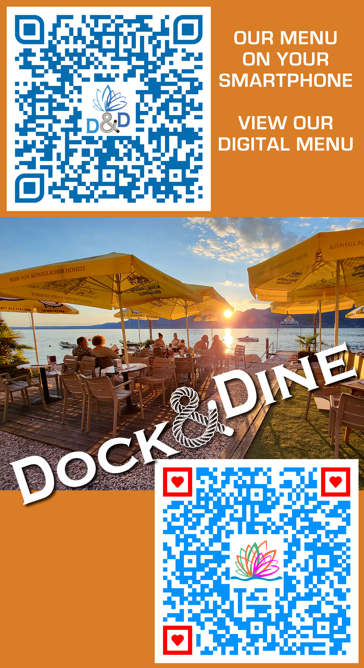 Dock & Dine serve piatti italiani e specialità di lago e mare da abbinare ai cocktail e bevande rinfrescanti. Potrete gustare i nostri cibi e le bevande estive ammirando la vista panoramica sul lago dal patio privato del bar. Il nostro beach bar ha un'atmosfera informale in cui si può accedere in pantaloncini da surf e flip flop!